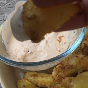 While the potatoes are cooking, make the sweet chilli dip. Combine the chilli sauce with the crème fraiche and stir well.